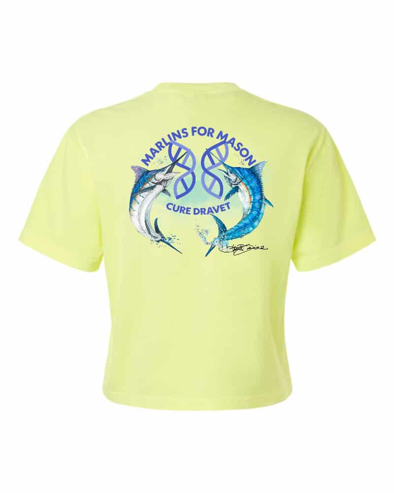 This neon yellow boxy crop women’s t-shirt features the 2025 Marlins for Mason logo on the back.