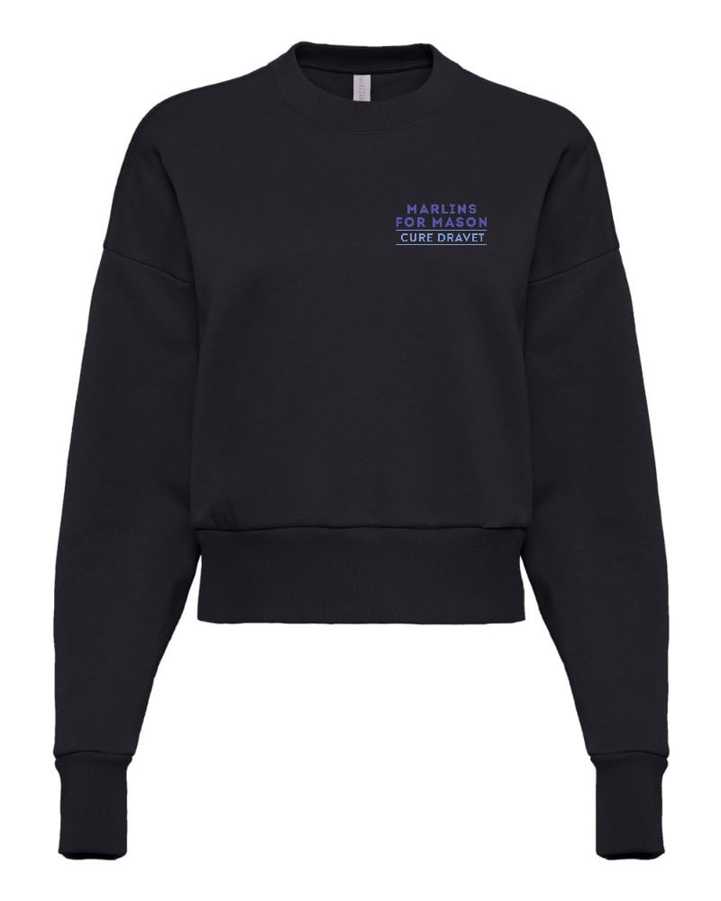 This light black women’s crewneck sweatshirt features the full 2025 Marlins for Mason logo on the back and smaller logo on front.