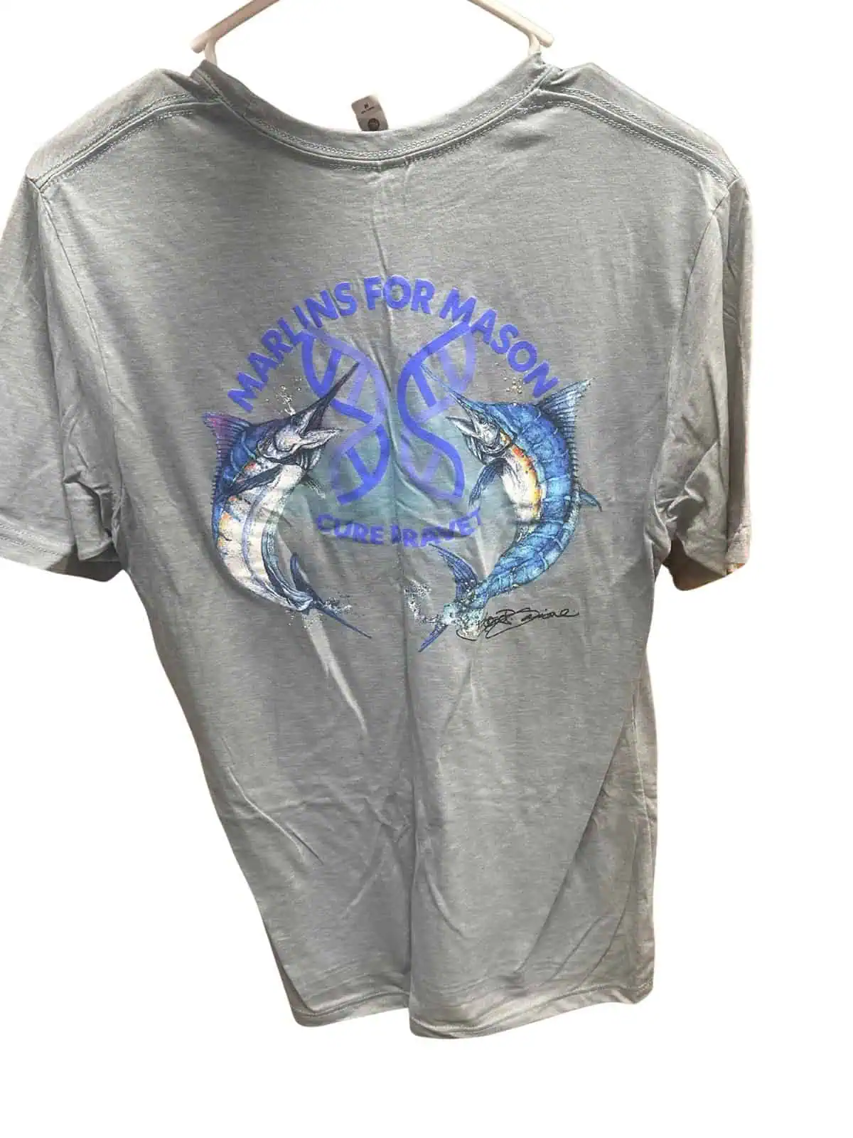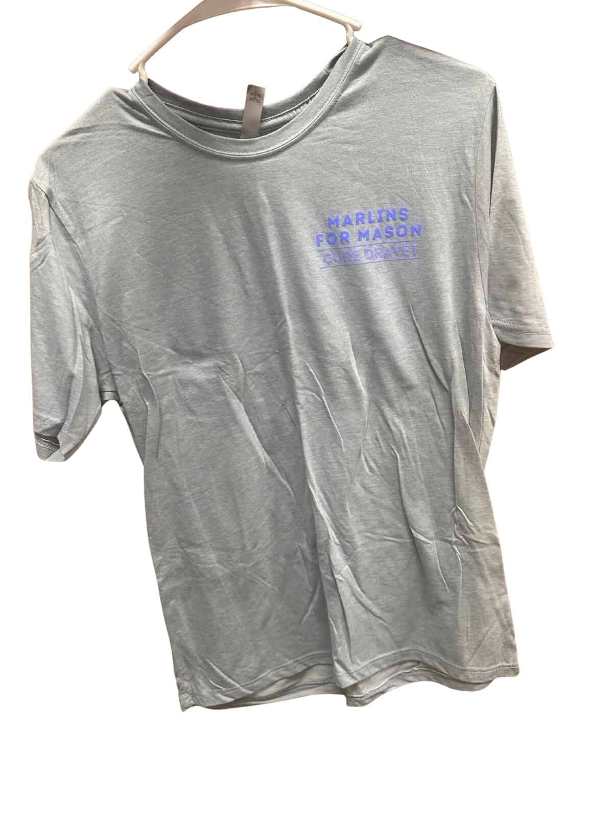 This light blue short sleeve t-shirt features the 2025 Marlins for Mason logo.