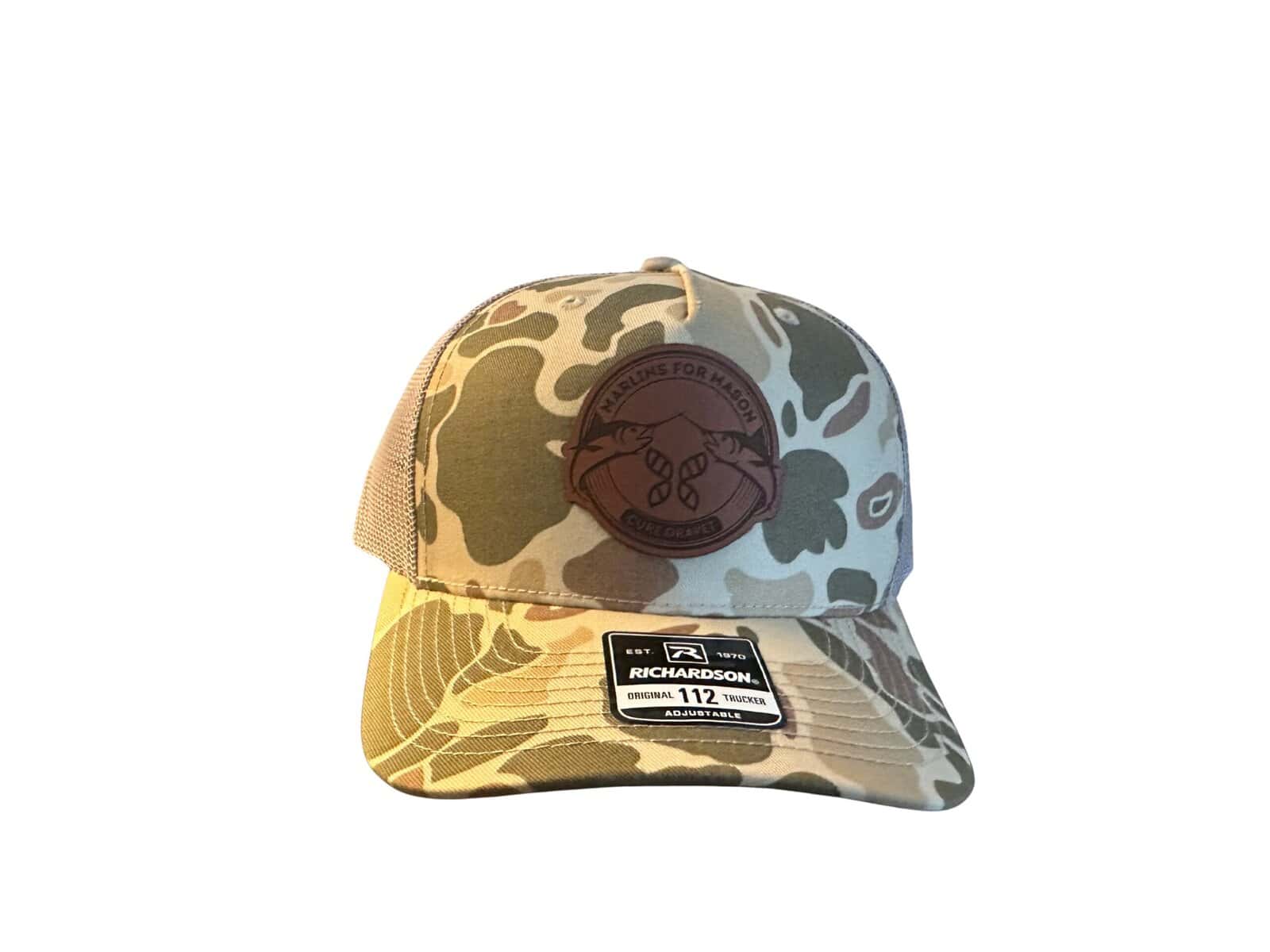 The acclaimed Richardson 112 Trucker takes to the outdoors with this printed five-panel iteration and Marlins for Mason logo on a brown leather patch. Hat is Duck Camo/Light Tan.