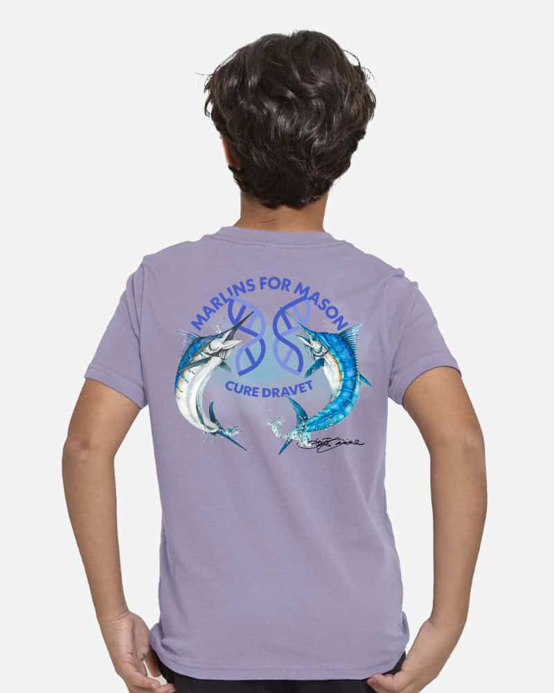 This purple short sleeve 100% cotton t-shirt in youth sizes features the Marlins for Mason logo on the back.